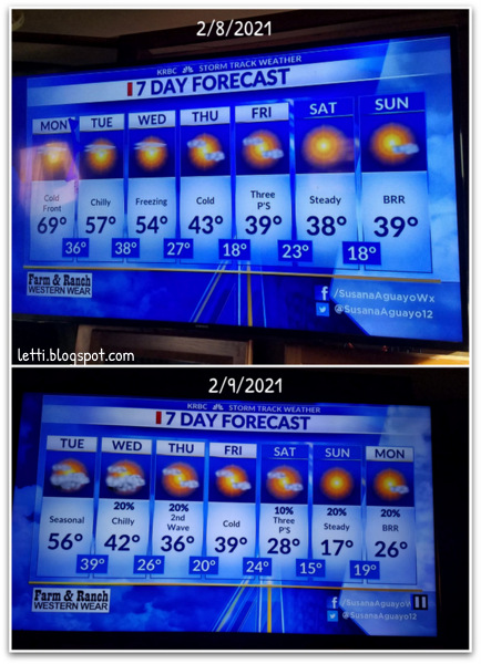 From one day to the next, the predictions have dropped by >10 degrees Fahrenheit for the coming weekend, into below freezing during the day time. Here's hoping the electricity supply keeps up, and pipes hold up.